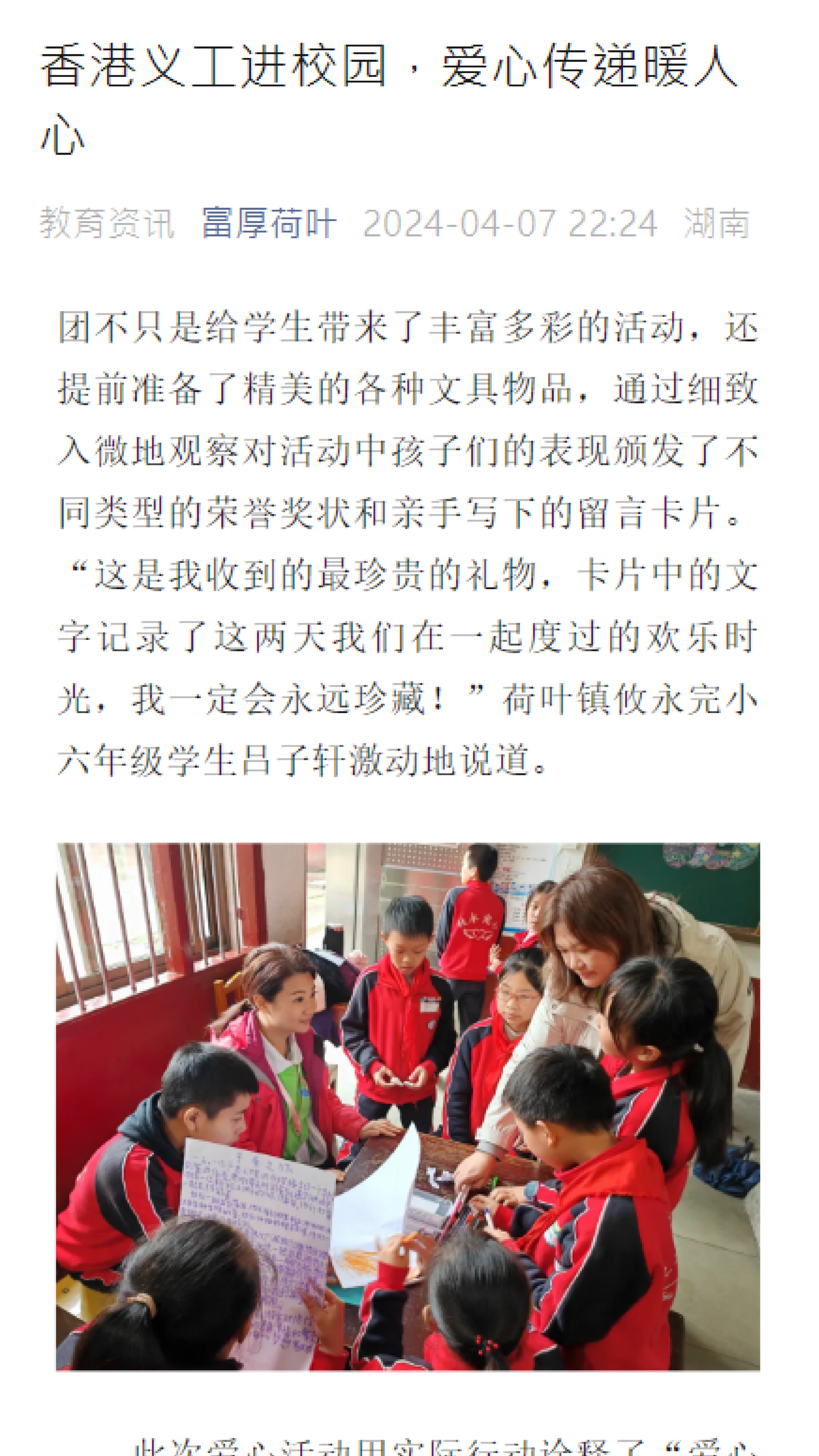卓藝義工團又再出動! 4月份,公司員工一行人踏上義行之旅,前往湖南婁底市進入校園,與小朋友一起度過了充滿歡笑的三天!我們透過團體遊戲,快速拉近了義工們與小朋友們之間的距離。 與小朋友真摯交流的過程中,我們與小朋友交換親手寫的留言卡、送出一份份文具用品,除了帶給小朋友的快樂回憶,也希望留低一份心意和鼓勵。雖然只是相處短短數天,但離別時都讓人非常依依不捨…… 同時,感謝香港慈善機構「傳心源」 提供是次寶貴的交流機會,讓這份愛心傳遞下去,讓更多的人感受到溫暖和幸福。?