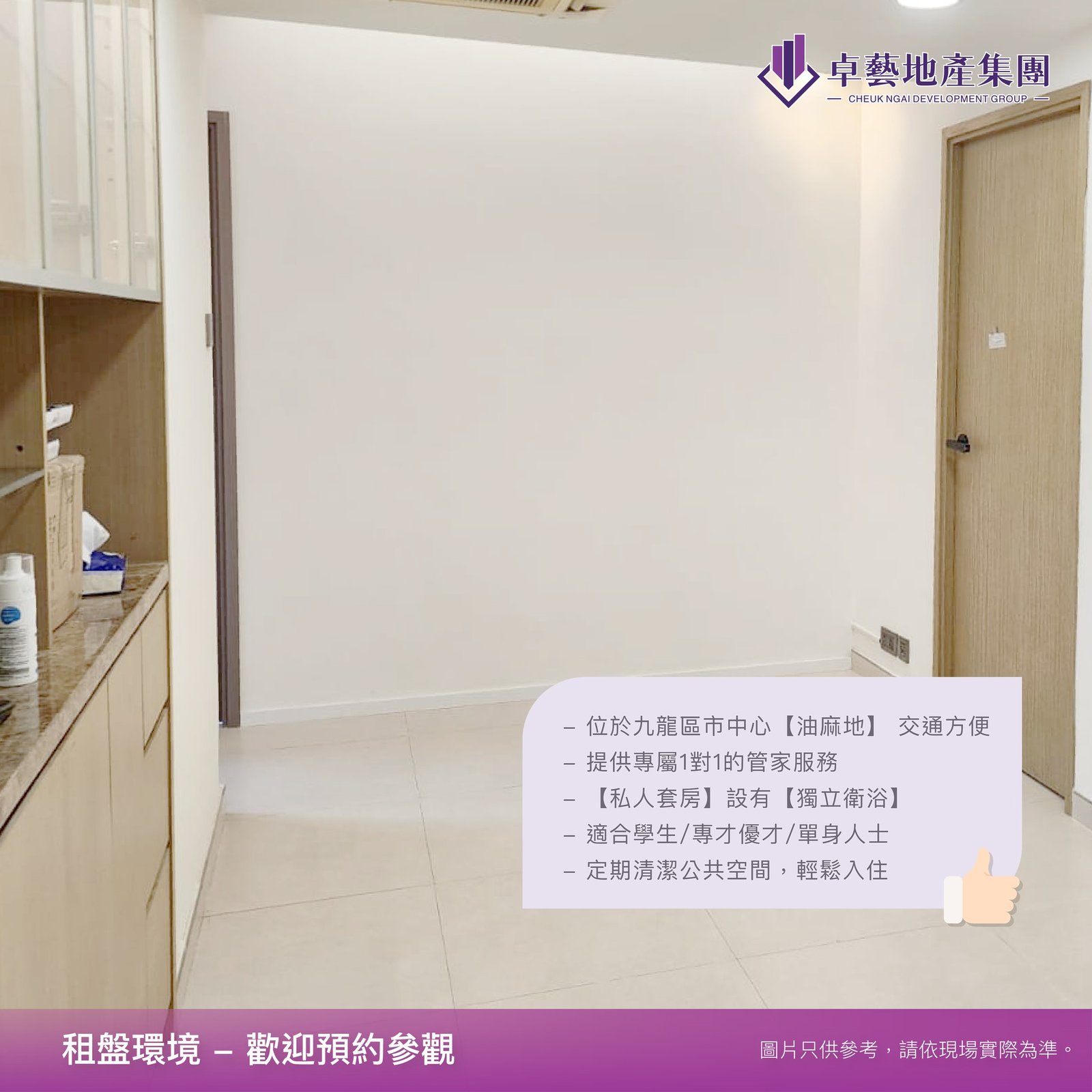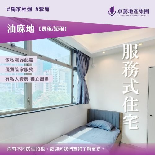 全新裝修的服務式住宅,位於九龍區市中心,交通方便,提供不同傢私電器配套。私人衛浴套房自帶1 on 1管家服務及定期清潔共享空間,適合學生/ 專才優才/ 單身人士輕鬆入住,尚有多款租盤招租,歡迎查詢了解更多!
